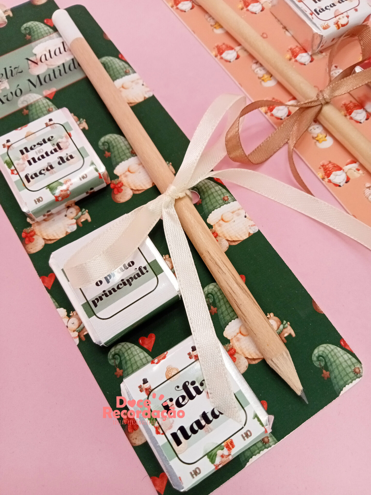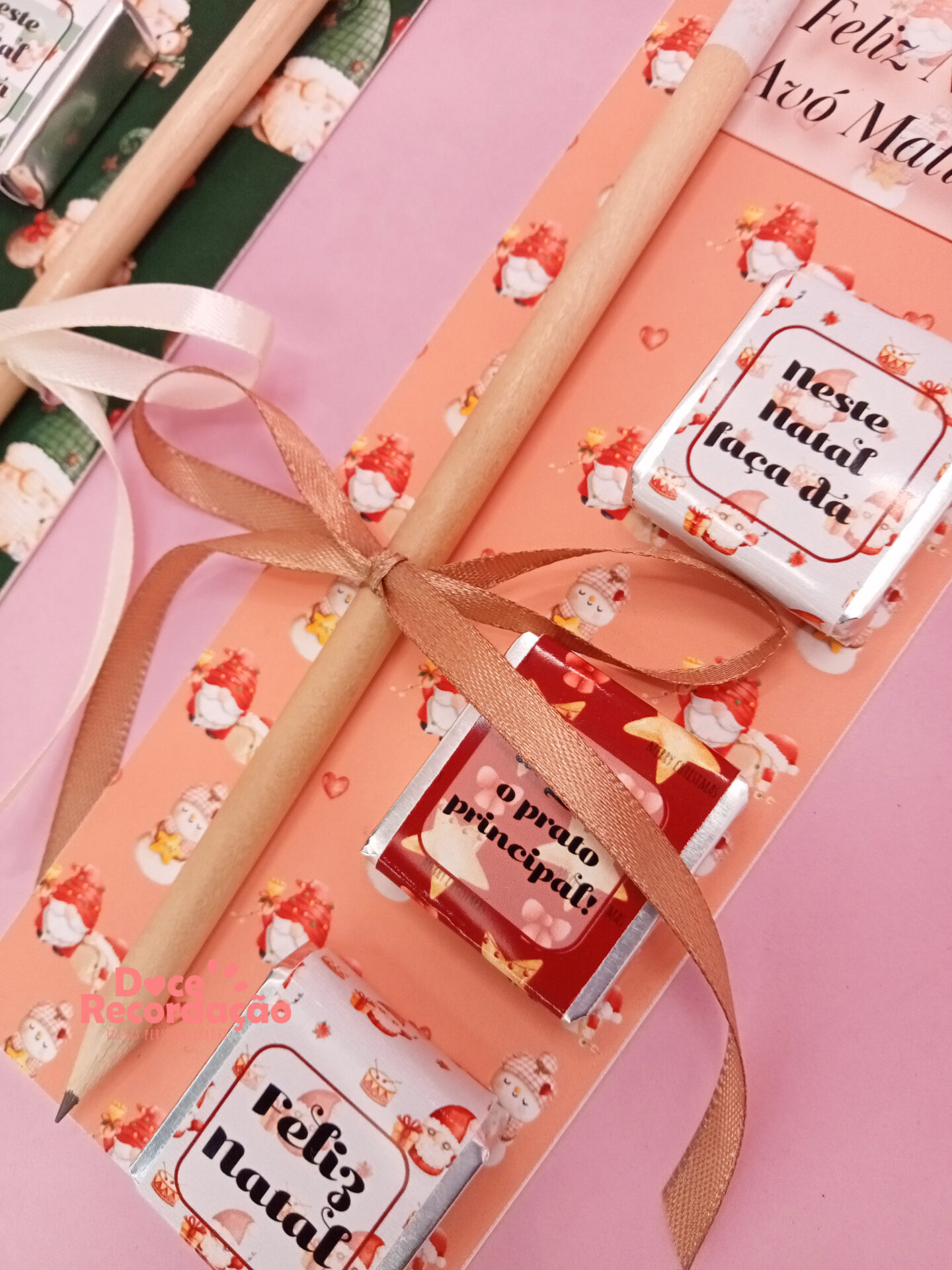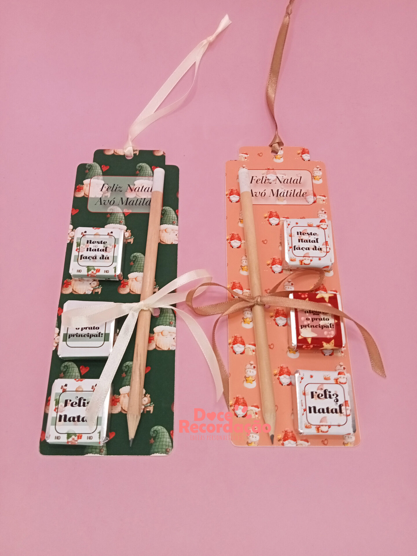Marcador de livro com 3 napolitanas de chocolate com mensagem personalizável.